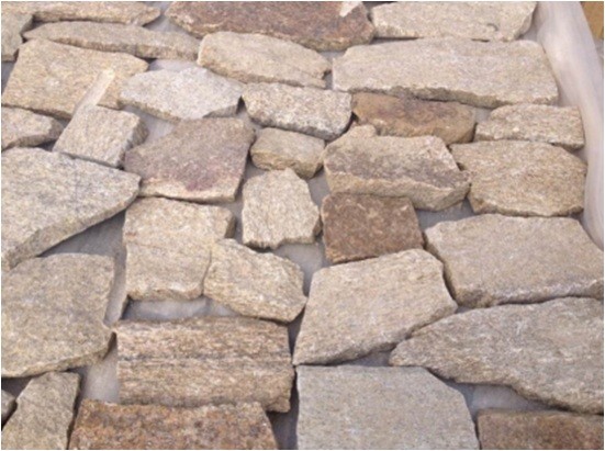 BSS-631 is yellow granite random flagstone, natural paving stone, granite landscaping stones, irregular patio flooring pavers stone, crazy stone, granite wall coverting stone. Natural finish, the edges can be natural split or machine-cut finish.
